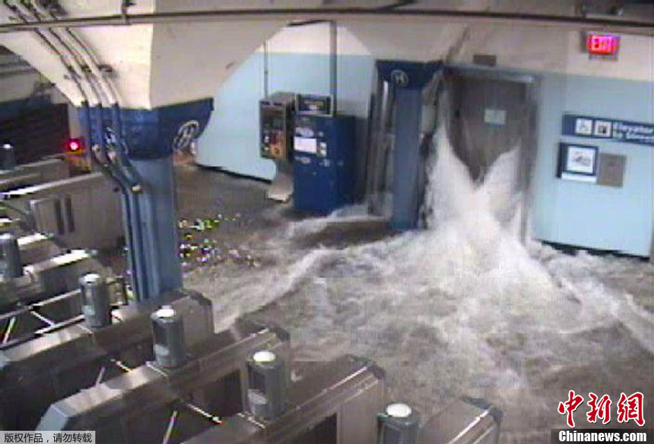 当地时间10月29日,美国纽约,飓风“桑迪”肆虐过后,纽约许多地铁站内积水严重,整个地铁系统遭到重创,几乎处于瘫痪状态。(地铁站内监控摄像头所拍画面)