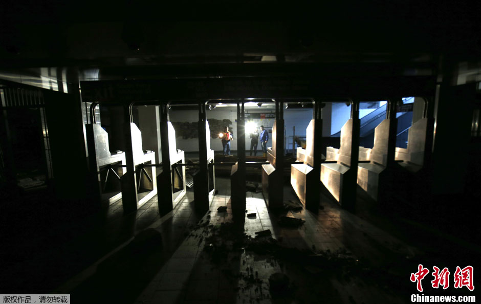 当地时间10月30日,美国纽约,飓风“桑迪”肆虐过后,纽约许多地铁站内积水严重,整个地铁系统遭到重创,几乎处于瘫痪状态。