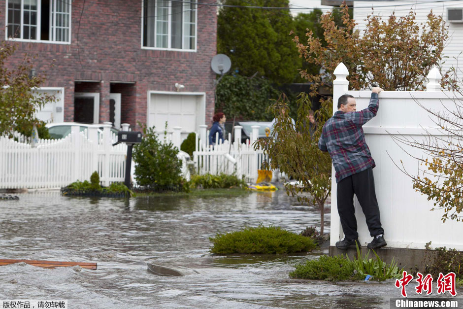 当地时间10月31日,美国纽约,飓风“桑迪”肆虐过后,当地遭到洪水侵袭,一名市民艰难地朝家的方向走去。