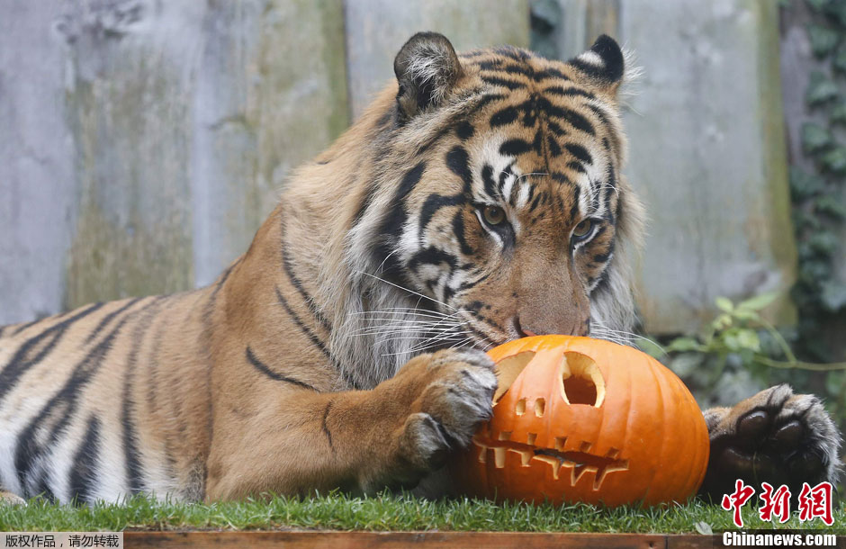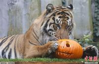 当地时间10月30日,英国伦敦动物园,动物齐出动庆祝万圣节。图为一只苏门答腊虎。
