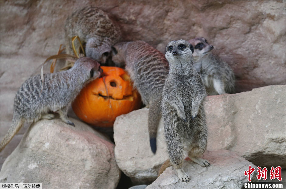当地时间10月30日,英国伦敦动物园,动物齐出动庆祝万圣节。图为一群狐蒙。