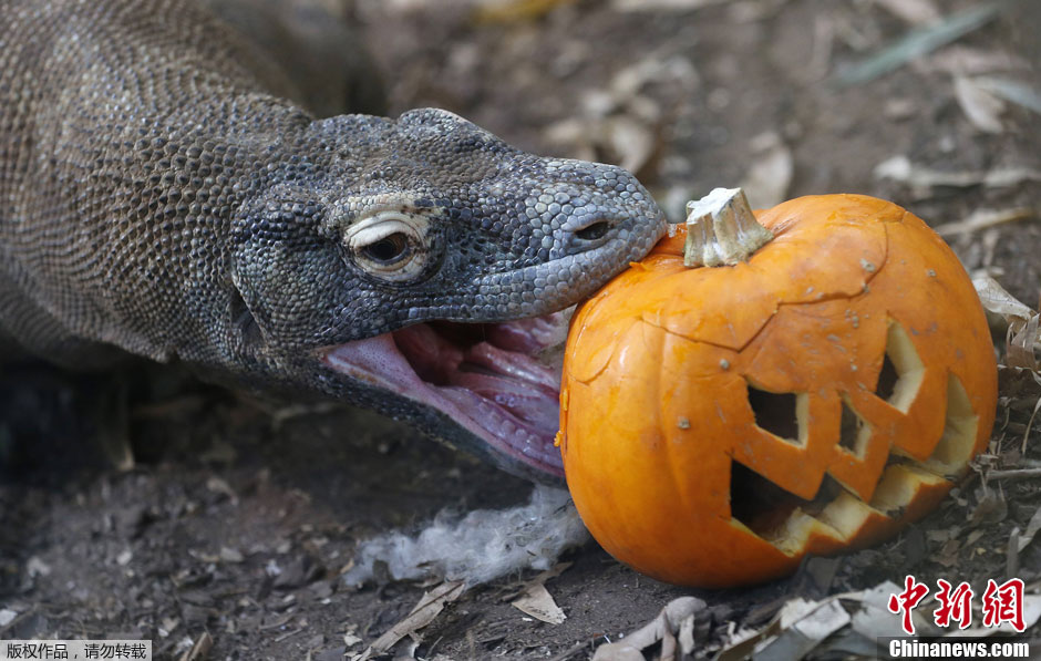 当地时间10月30日,英国伦敦动物园,动物齐出动庆祝万圣节。图为一只科莫多龙。