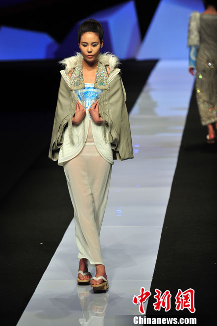 透视装服饰是近年来T台上大热的潮流趋势,在近期的中国国际时装周上,多名设计师和品牌发布会大玩飘逸透视装。国际设计师们不约而同地选择了用薄质网状或钩织蕾丝来装饰自己的作品,半透明的织物让肌肤不用直接暴露在外,这种犹抱琵琶半遮面的把戏彰显出了婉约的性感。中新网记者 金硕 摄
