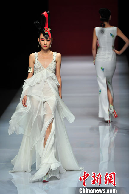 透视装服饰是近年来T台上大热的潮流趋势,在近期的中国国际时装周上,多名设计师和品牌发布会大玩飘逸透视装。国际设计师们不约而同地选择了用薄质网状或钩织蕾丝来装饰自己的作品,半透明的织物让肌肤不用直接暴露在外,这种犹抱琵琶半遮面的把戏彰显出了婉约的性感。中新网记者 金硕 摄