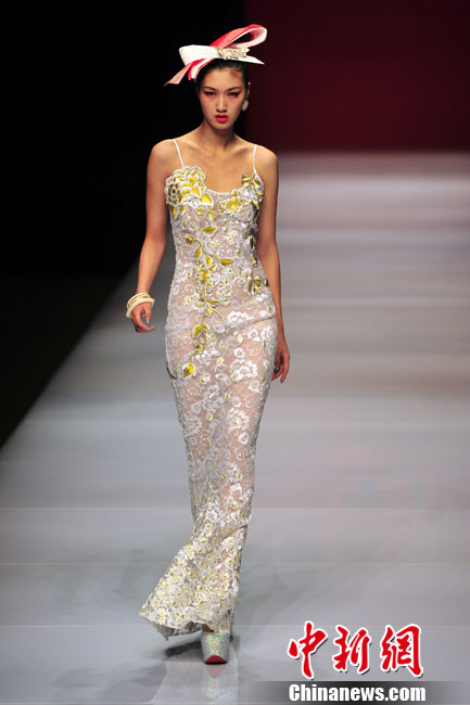 透视装服饰是近年来T台上大热的潮流趋势,在近期的中国国际时装周上,多名设计师和品牌发布会大玩飘逸透视装。国际设计师们不约而同地选择了用薄质网状或钩织蕾丝来装饰自己的作品,半透明的织物让肌肤不用直接暴露在外,这种犹抱琵琶半遮面的把戏彰显出了婉约的性感。中新网记者 金硕 摄
