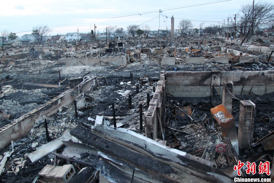 在纽约飓风的重灾区——皇后区洛克威半岛(Rockaway Peninsula)的沿海社区Breezy Point,飓风“桑迪”10月29日导致当地电线杆倒塌引起大火,“桑迪”带来的狂风又将火势扩大。这场大火持续十多个小时才被扑灭,百余幢房屋被烧毁。图为11月1日拍摄的火灾现场大片残骸。李洋 摄