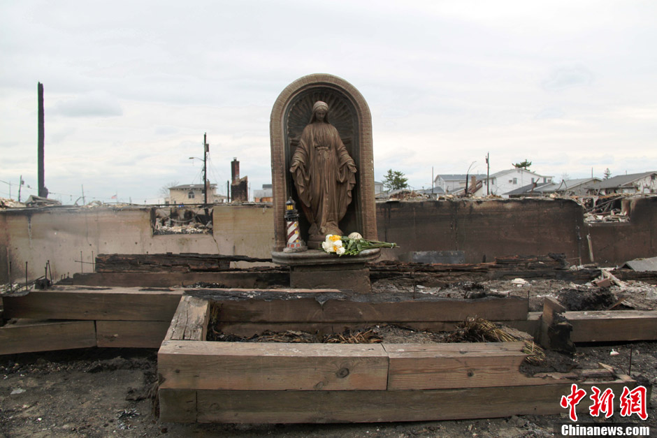 在纽约飓风的重灾区——皇后区洛克威半岛(Rockaway Peninsula)的沿海社区Breezy Point,飓风“桑迪”10月29日导致当地电线杆倾倒引起大火,“桑迪”带来的狂风又将火势扩大。这场大火持续十多个小时才被扑灭,百余幢房屋被烧毁。图为11月1日,一座圣母玛利亚的雕像依然在火灾现场矗立,圣母像下摆放着灯塔模型和鲜花。李洋 摄