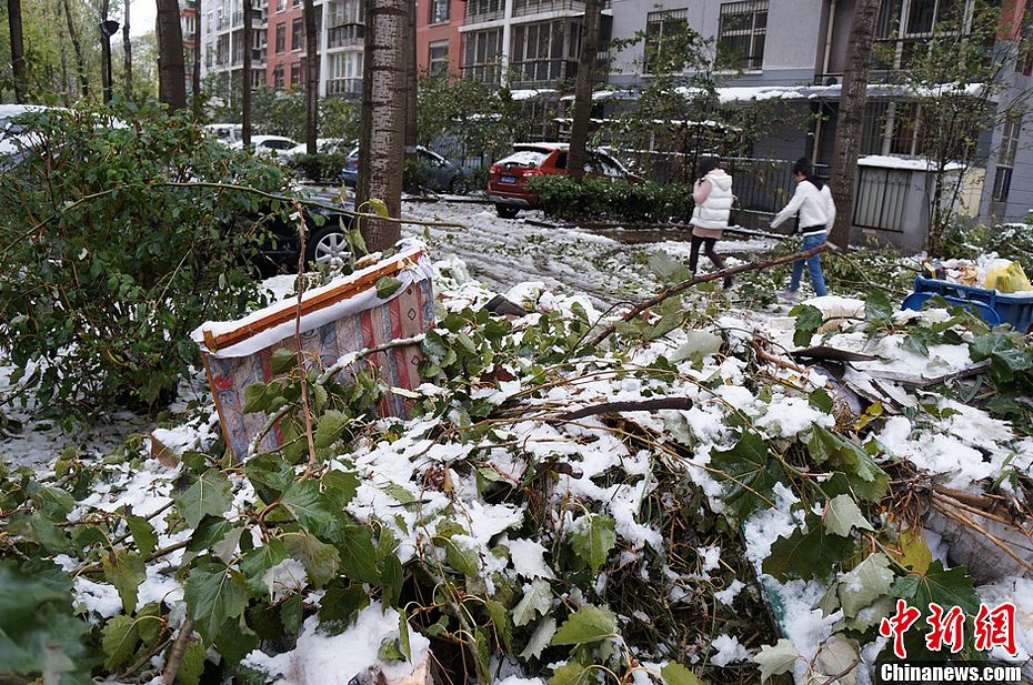 11月4日,北京回龙观地区,经过一夜风雪,一居民小区内大量杨树被大雪压折,遍地残枝落叶,部分车辆受损。11月4日凌晨,北京的持续中雨因大风降温改为雨加雪,降下年度初雪,城区部分地区降雪量超过10厘米。中新网记者 周维 摄
