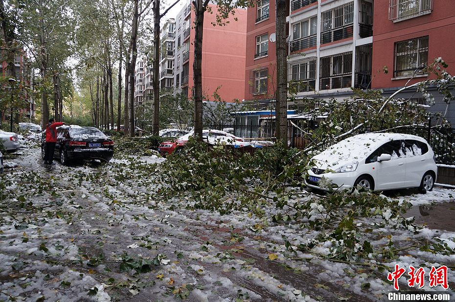 11月4日,北京回龙观地区,经过一夜风雪,一居民小区内大量杨树被大雪压折,遍地残枝落叶,部分车辆受损。11月4日凌晨,北京的持续中雨因大风降温改为雨加雪,降下年度初雪,城区部分地区降雪量超过10厘米。中新网记者 周维 摄