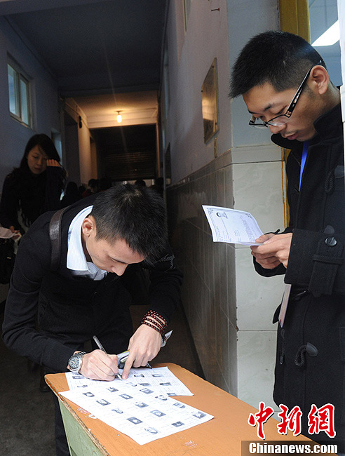 11月4日,四川省2012年下半年公开录用公务员笔试举行。统计数据显示,四川全省共有22.7万余人报名应考,竞争8821个岗位,最高考录比达到671:1,报考人数再创四川公招考试规模历史新高。图为考生签字进入考场。张浪 摄