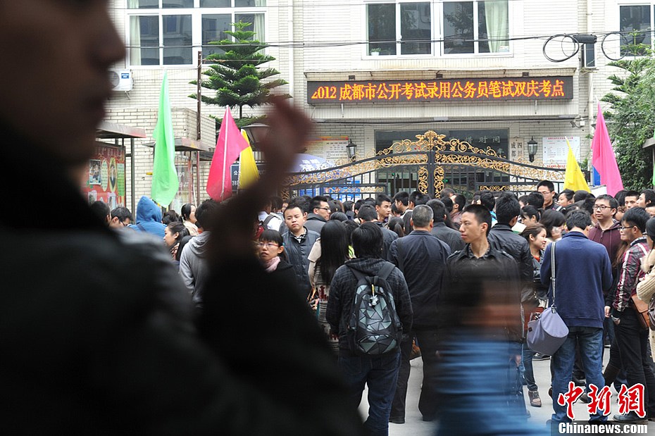 11月4日,四川省2012年下半年公开录用公务员笔试举行。统计数据显示,四川全省共有22.7万余人报名应考,竞争8821个岗位,最高考录比达到671:1,报考人数再创四川公招考试规模历史新高。图为成都双庆中学考点,考生陆续进入考场。张浪 摄