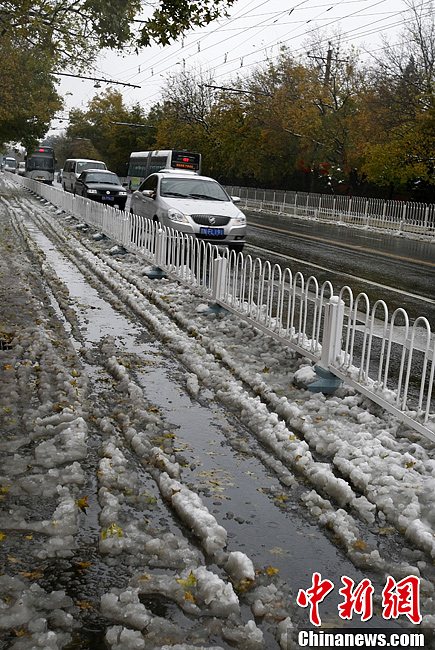 11月4日,北京气象部门在发布暴雪预警之后又追发了道路结冰全市黄色及西部北部橙色预警信号,目前京城的路面温度低于0摄氏度,12小时内将出现道路结冰。中新社发 李慧思 摄