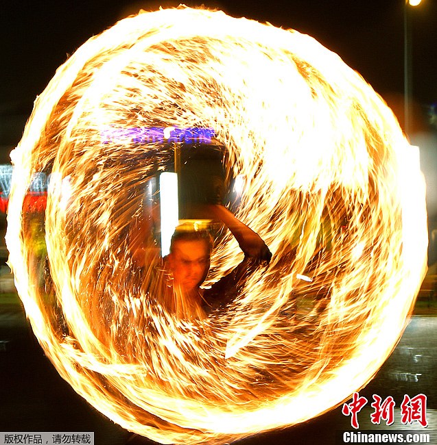 当地时间2012年11月3日,立陶宛维尔纽斯街头火舞演员正在进行火舞排练,形成一道道绚丽的光影。