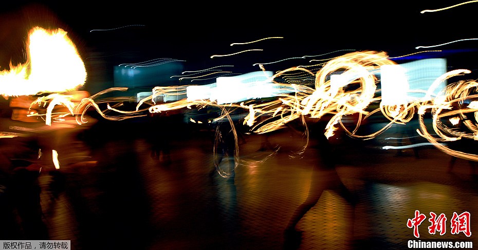 当地时间2012年11月3日,立陶宛维尔纽斯街头火舞演员正在进行火舞排练,形成一道道绚丽的光影。