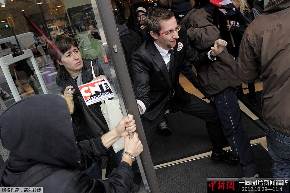 周三(10月31日),西班牙巴塞罗那,联合总工会(CGT)和全国劳工联合会(CNT)的成员举行了示威游行,反对政府实行财政紧缩措施。图为游行中,Zara商店的一名保安试图将示威者挡在门外。