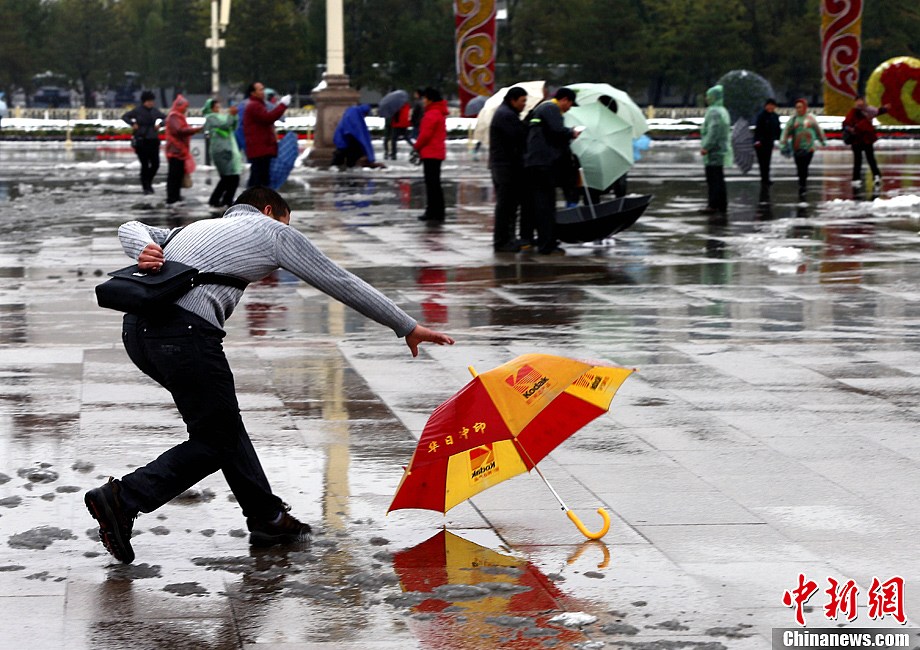 11月4日,一位游客在北京天安门广场准备捡起被吹走的伞。截至4日5时,北京市平均降雪量达14.1毫米,最大为延庆50.1毫米。截至4日8时,北京城区平均降水量达58.7毫米,最大为海淀凤凰岭96毫米。降水量突破历史同期极值。从3日早上开始,北京风雨雪天气将一直持续40小时。中新社发 张浩 摄