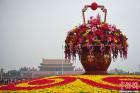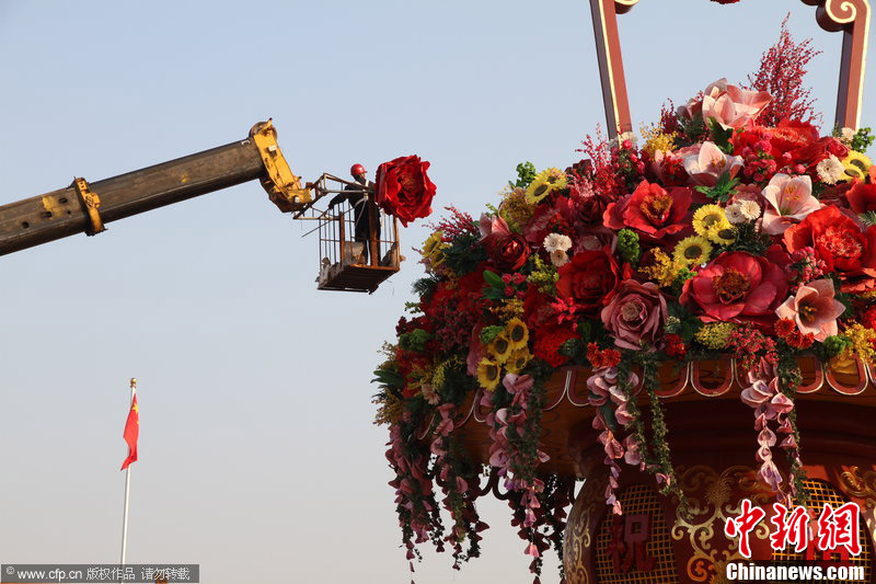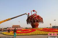 天安门“祝福祖国”主题花坛进行补花维护