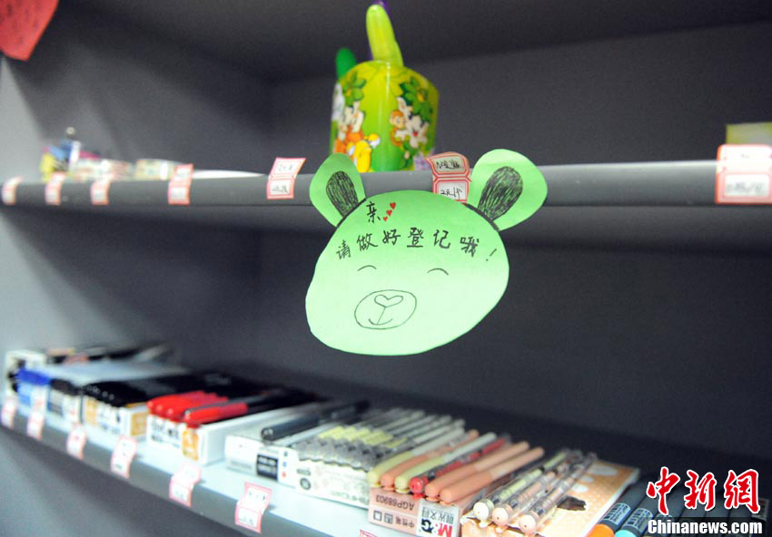 近来在吉林财经大学第一教学楼内,出现一个将近两米高的灰色柜子,柜上写着“大诚小爱”诚信义卖站。图为义卖站商品以各类学习用品为主。张瑶 摄
