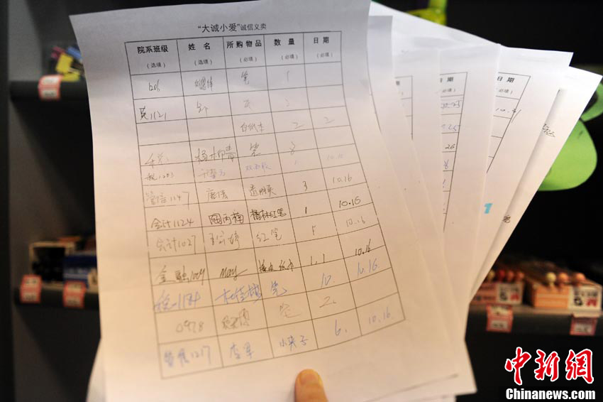 近来在吉林财经大学第一教学楼内,出现一个将近两米高的灰色柜子,柜上写着“大诚小爱”诚信义卖站。图为学生购买完商品后都会自觉登记。张瑶 摄