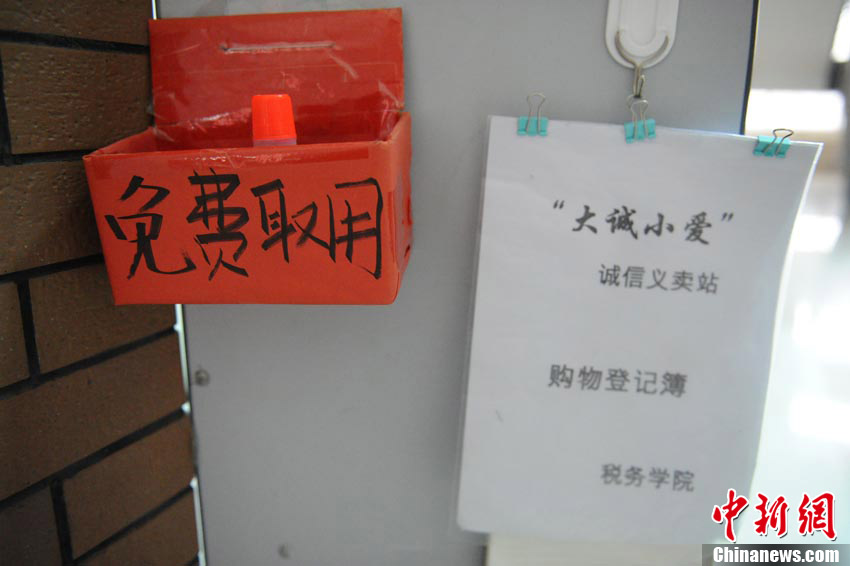 近来在吉林财经大学第一教学楼内,出现一个将近两米高的灰色柜子,柜上写着“大诚小爱”诚信义卖站。图为诚信义卖站中也会免费提供一些文具用品。张瑶 摄