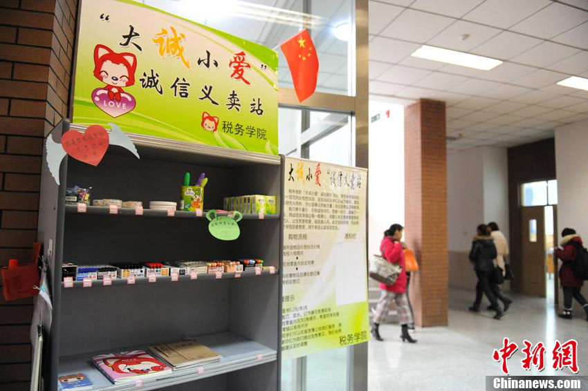 近来在吉林财经大学第一教学楼内,出现一个将近两米高的灰色柜子,柜上写着“大诚小爱”诚信义卖站。图为诚信义卖站。张瑶 摄