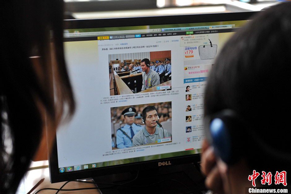 11月6日,湄公河致13名中国船员遇害案在昆明市中级人民法院一审宣判,糯康等四名主犯被判处死刑,其余两被告分别被判处死缓和有期徒刑8年。2011年10月5日,两艘中国商贸船只在湄公河“金三角”地区水域遭劫持,13名中国籍船员在湄公河泰国水域被枪杀。图为昆明一写字楼内员工关注网络直播的庭审进展。中新社发 任东 摄