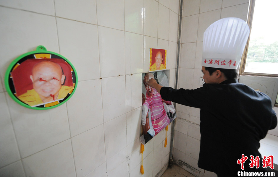 11月6日,长沙市一餐馆内,一名员工正在发泄室里向老板的照片拳打脚踢。为让员工以最佳状态为客人服务,该餐馆老板专门为员工设了一间发泄室,老板把自己的头像做成“靶子”,让员工挥拳发泄。图为员工正在向老板的照片发泄。杨华峰 摄