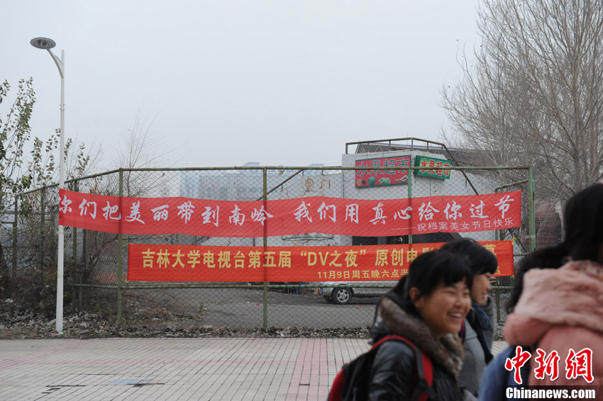 11月7日,记者在长春一家理工类高校校园内见到24条红色条幅,上写着“难忘初识回眸的笑靥 此刻你是最美的风景”、“今天,你是我们的沈佳宜”等温馨、搞笑标语。据了解,在这所学校里,男女生比例为7:1。所以在光棍节前夕,这所高校的“理工男”们自发组织创立了一个“女生节”。节日期间,女生们会收到各式各样的礼物,包括一份早餐、一封情书,甚至是有男生在宿舍楼下深情献歌。不过,这一切和恋爱没有关系,只是“理工男”们对女生们表达的一份祝福。张瑶 摄
