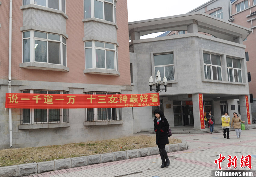 11月7日,记者在长春一家理工类高校校园内见到24条红色条幅,上写着“难忘初识回眸的笑靥 此刻你是最美的风景”、“今天,你是我们的沈佳宜”等温馨、搞笑标语。据了解,在这所学校里,男女生比例为7:1。所以在光棍节前夕,这所高校的“理工男”们自发组织创立了一个“女生节”。节日期间,女生们会收到各式各样的礼物,包括一份早餐、一封情书,甚至是有男生在宿舍楼下深情献歌。不过,这一切和恋爱没有关系,只是“理工男”们对女生们表达的一份祝福。张瑶 摄