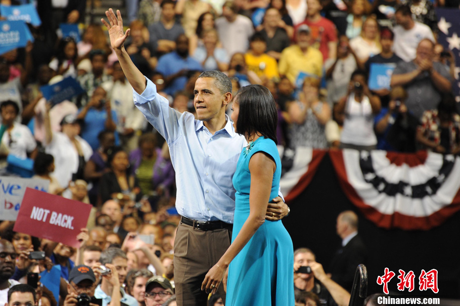 2012年美国大选结果于当地时间7日凌晨出炉。奥巴马目前已经获得274张选举人票,成功连任。图为2012年5月5日奥巴马与米歇尔夫妇在弗吉尼亚首府里士满的一所大学里举行首轮竞选集会,演讲台前的Forward一词就是当天会上正式公布的竞选口号——“前进”。(资料图)中新社发 吴庆才 摄