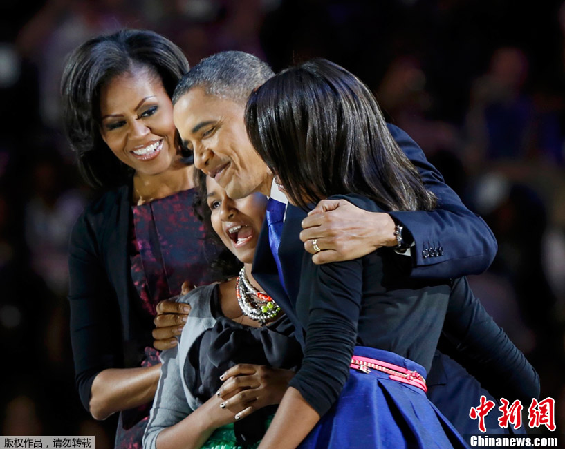 2012年美国大选结果于当地时间7日凌晨出炉。奥巴马目前已经获得274张选举人票,成功连任。图为在芝加哥,在庆祝大选胜利的集会上,奥巴马携妻子女儿现身,感谢支持者。