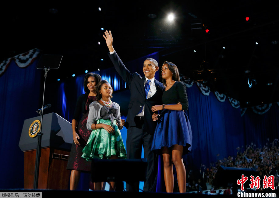 2012年美国大选结果于当地时间7日凌晨出炉。奥巴马目前已经获得274张选举人票,成功连任。图为在芝加哥,在庆祝大选胜利的集会上,奥巴马携妻子女儿现身,感谢支持者。