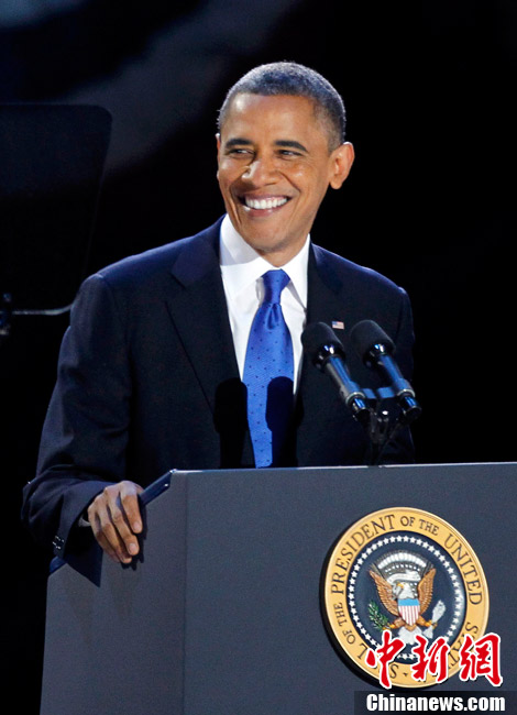 2012年美国大选结果于当地时间7日凌晨出炉。奥巴马目前已经获得274张选举人票,成功连任。图为在芝加哥,在庆祝大选胜利的集会上,奥巴马发表胜选演说。