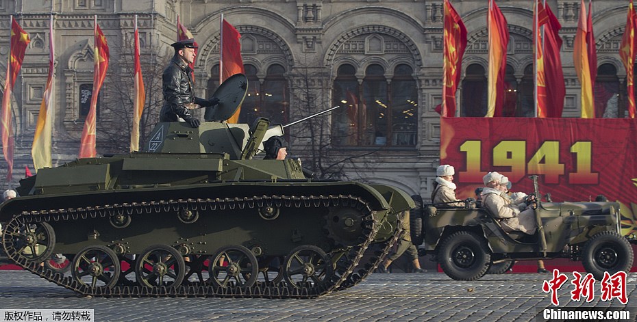 当地时间11月7日,俄罗斯首都莫斯科举行盛大阅兵式,纪念二战时期红场阅兵71周年。1941年11月7日,在德国法西斯军队兵临莫斯科城下之际,苏联红军在红场上举行了阅兵式。参加阅兵式的部队在阅兵完毕后直接开赴前线同入侵的法西斯德军作战。图为阅兵式现场。