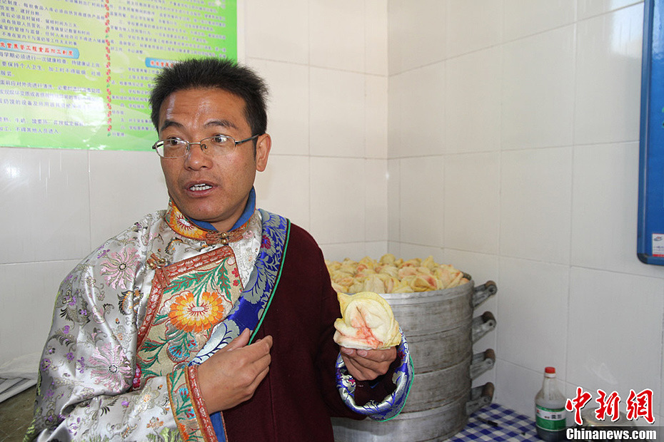 为促进教育公平和义务教育均衡发展,提高和改善农村小学生健康水平,国家决定从2012年春季学期启动贫困县农村小学营养改善计划试点工作。国家农村义务教育学生营养改善计划将在甘肃省58个试点县全面实施,天祝藏族自治县是其中之一。图为天祝藏族自治县石门镇中心小学校长叶多杰才让每天都要检查学生营养餐的卫生安全。张道正 摄