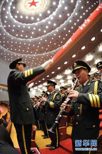 11月8日,中国共产党第十八次全国代表大会在北京人民大会堂隆重开幕。 这是军乐团演奏国歌。李涛 摄 图片来源:新华网