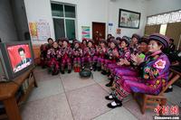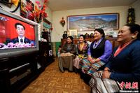 11月8日上午,西藏自治区拉萨市城关区冲赛康居委会居民琼达(左一)和邻居们一起收看中国共产党第十八次全国代表大会开幕电视直播。中新社发 李林 摄