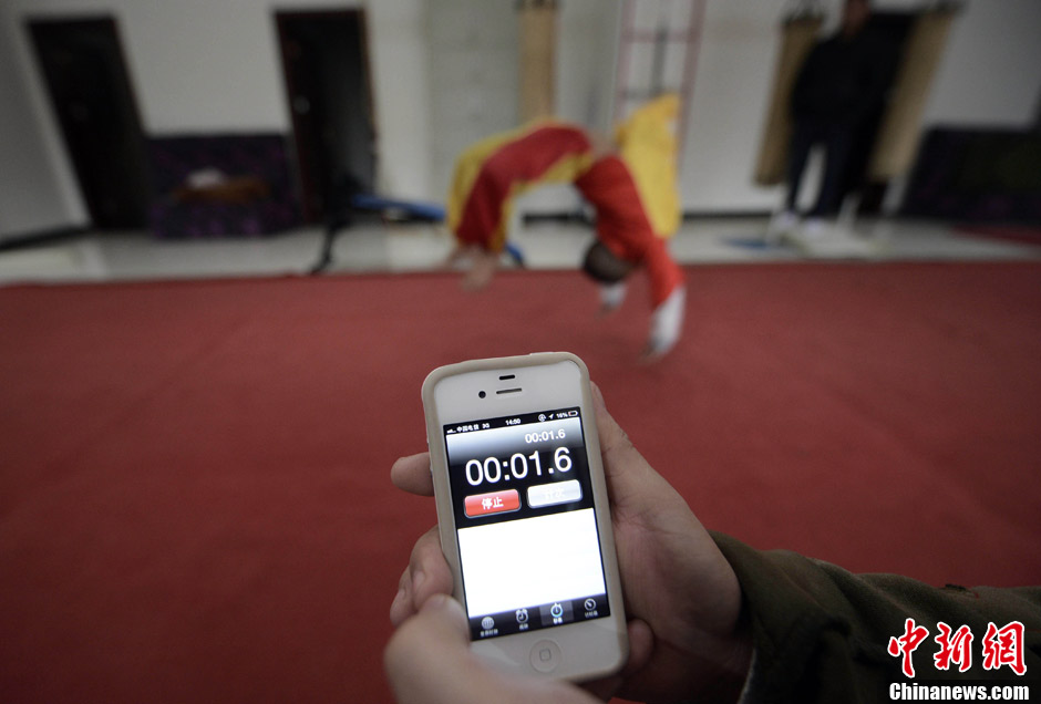 为打破30秒后空翻世界纪录,龙第豪在教练的陪伴下不停苦练。中新社发 渝友 摄 图片来源:CNSPHOTO