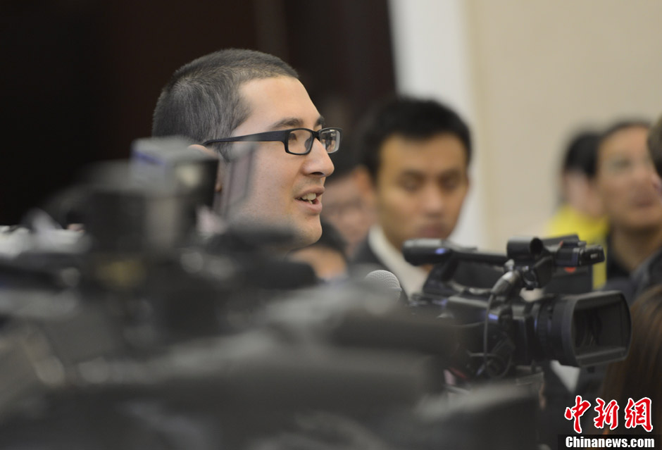 11月9日,十八大广东团讨论向中外记者开放。在提问环节汪洋说,最后一个问题请照顾那位“高富帅”的外国记者,随后英国记者向汪洋发问。中新社发 廖攀 摄