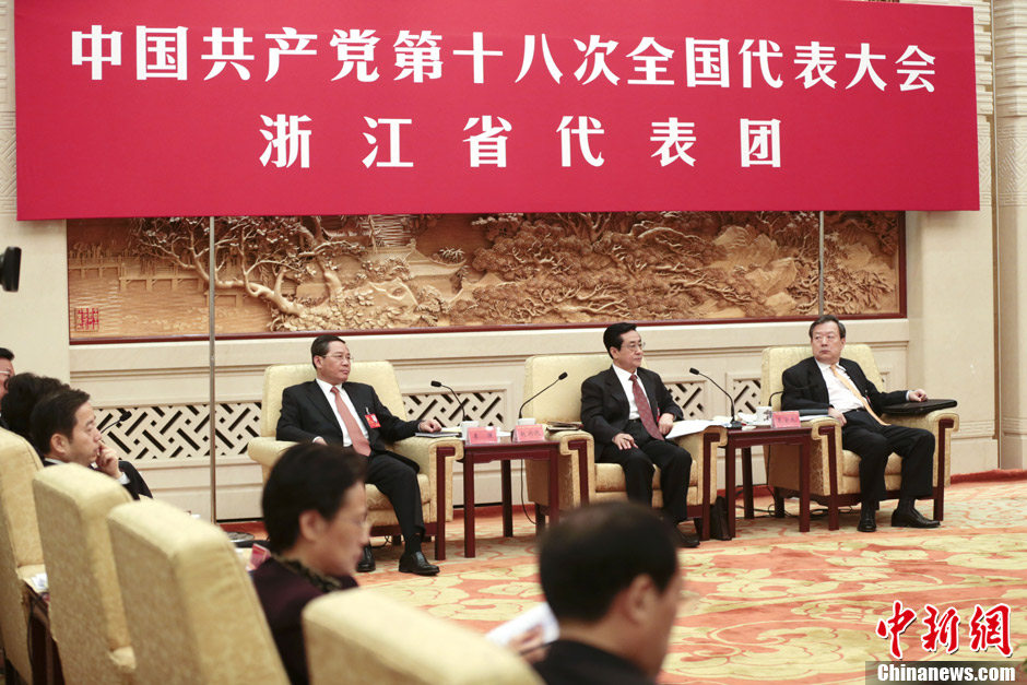 11月9日,十八大浙江省代表团在北京人民大会堂讨论大会报告,并对中外媒体开放。中新社发 盛佳鹏 摄