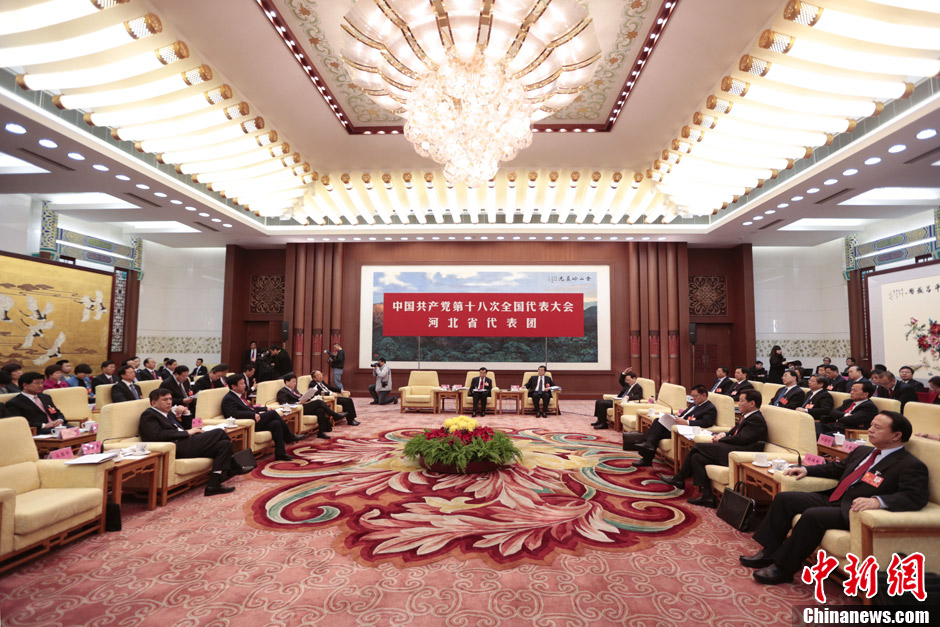 11月9日,十八大河北省代表团在北京人民大会堂讨论大会报告,并对中外媒体开放。中新社发 盛佳鹏 摄