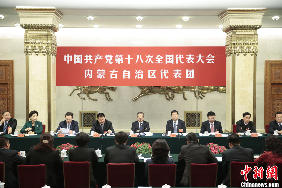 11月9日,十八大内蒙古代表团在北京人民大会堂讨论大会报告,并对中外媒体开放。中新社发 盛佳鹏 摄