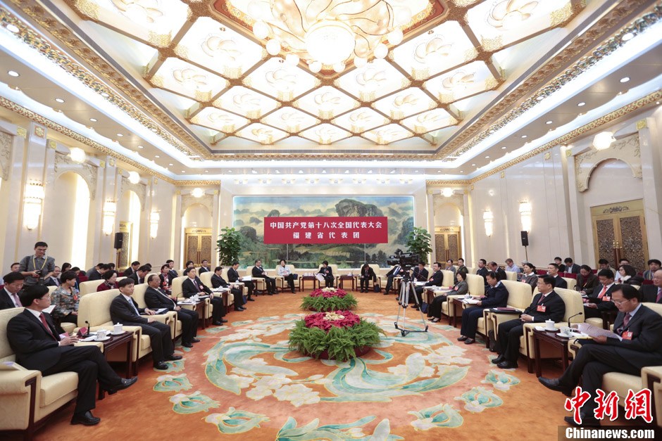 11月9日,十八大福建省代表团在北京人民大会堂讨论大会报告,并对中外媒体开放。中新社发 盛佳鹏 摄