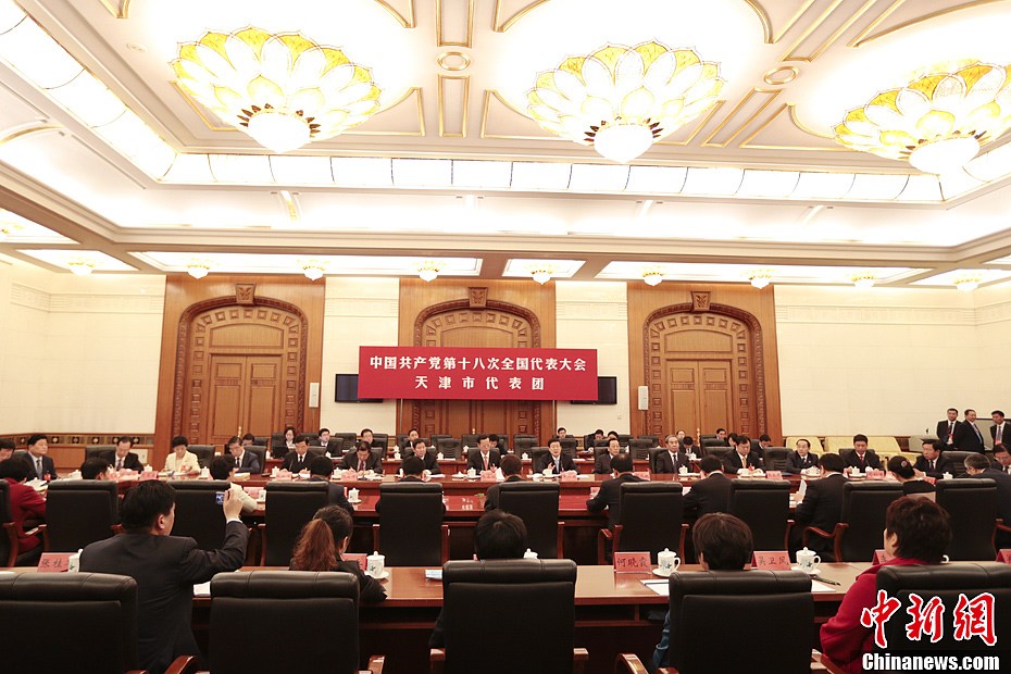 11月9日,十八大天津市代表团在北京人民大会堂讨论大会报告,并对中外媒体开放。中新社发 盛佳鹏 摄