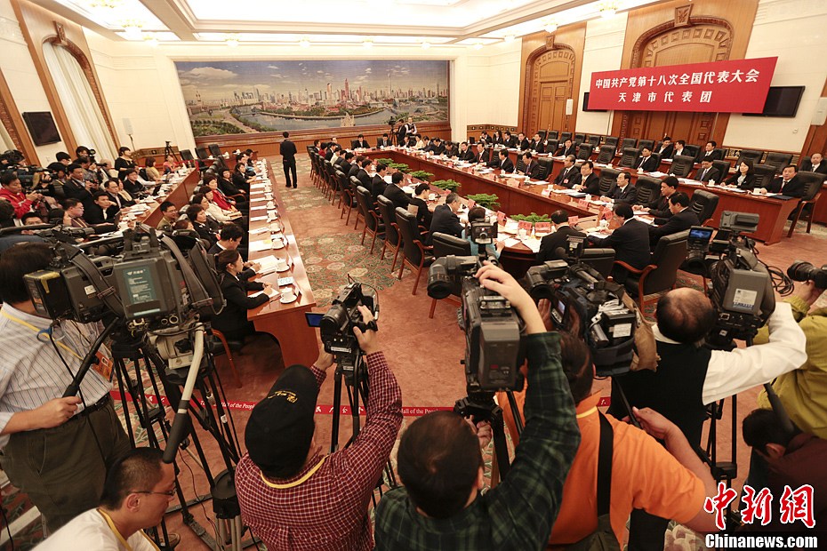 11月9日,十八大天津市代表团在北京人民大会堂讨论大会报告,并对中外媒体开放。中新社发 盛佳鹏 摄
