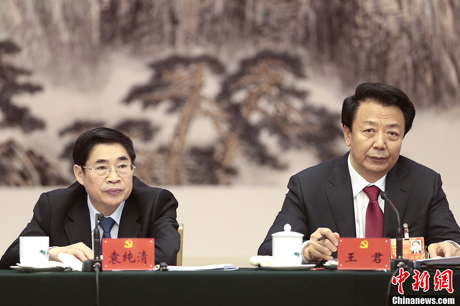 11月9日,十八大山西省代表团在北京人民大会堂讨论大会报告,并对中外媒体开放。图为山西省委书记袁纯清、省长王君参加讨论。中新社发 盛佳鹏 摄