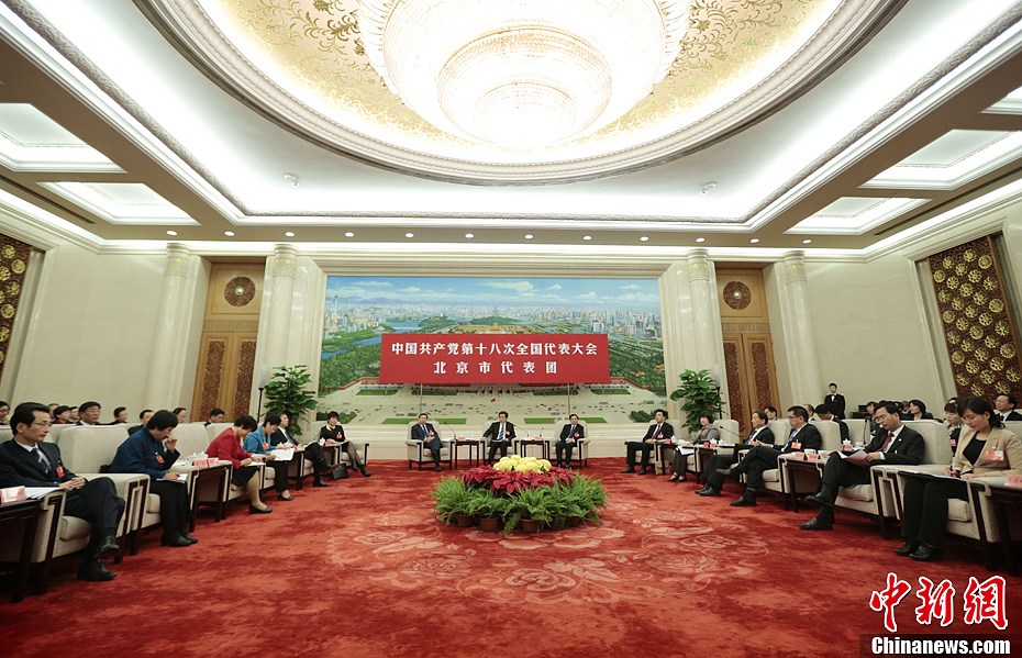 11月9日,十八大北京市代表团在北京人民大会堂讨论大会报告,并对中外媒体开放。中新社发 盛佳鹏 摄