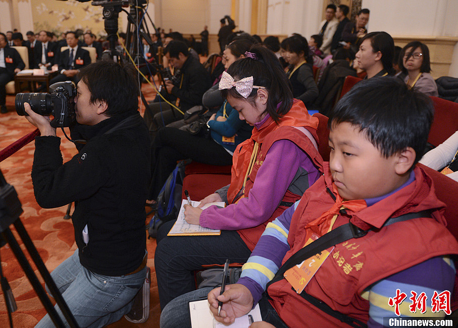 11月9日,十八大中央国家机关代表团在北京人民大会堂讨论大会报告,并对中外媒体开放。图为《中国少年报》小记者采访会议。中新社发 廖攀 摄