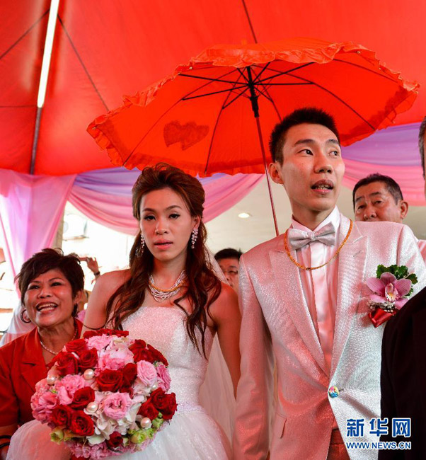 11月10日,李宗伟(右)与妻子黄妙珠在婚礼仪式上。当日,马来西亚羽毛球名将李宗伟与马来西亚前女单一号黄妙珠举行华人礼俗婚礼仪式。张纹综 摄 图片来源:新华网