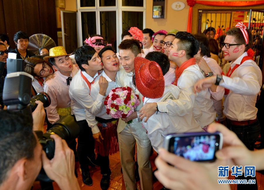 11月10日,李宗伟(中)在迎娶新娘仪式中与伴郎们合影。当日,马来西亚羽毛球名将李宗伟与马来西亚前女单一号黄妙珠举行华人礼俗婚礼仪式。张纹综 摄 图片来源:新华网